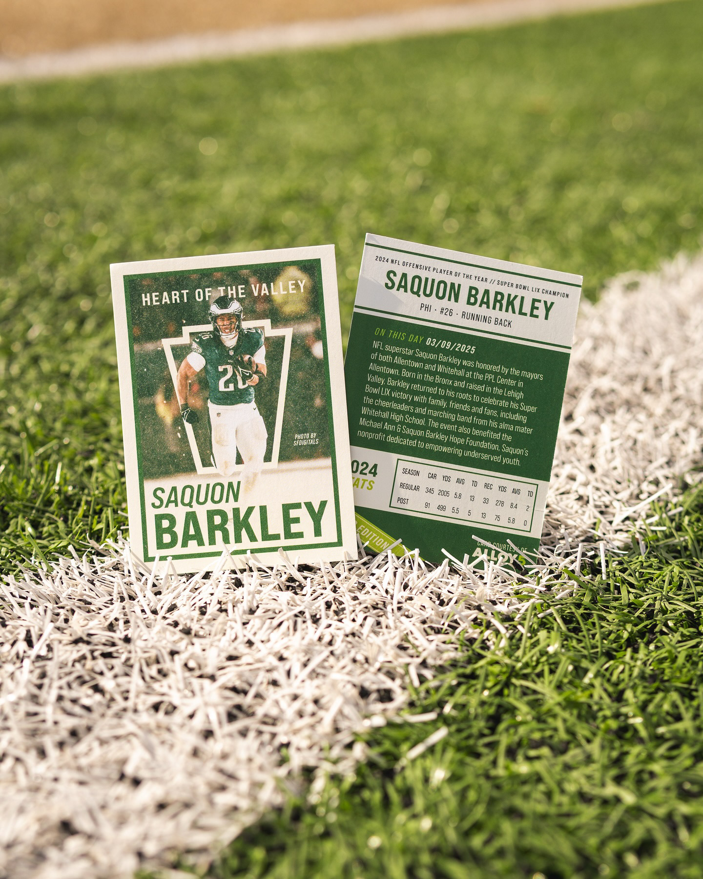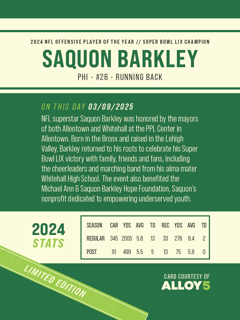 Earlier in 2025, the City of Allentown reached out to me at Alloy5 to design collateral for a special event honoring Saquon Barkley with a key to the city. Thanks to our existing relationship—and the popularity of the collectible stickers I’ve designed for past city events—they knew exactly who to call. With less than a week to bring the concept to life, we hit the ground running. We explored several formats, from posters to postcards, but ultimately landed on something that felt more meaningful and collectible: a custom trading card. Every sports fan understands the value of a trading card—especially one that’s limited-edition and one-of-a-kind. Saquon’s team provided an approved photograph from SF Digitals, and I built the design around it while carefully avoiding any use of copyrighted NFL or Eagles branding. The final piece served as a fitting keepsake to commemorate a hometown hero’s milestone moment.