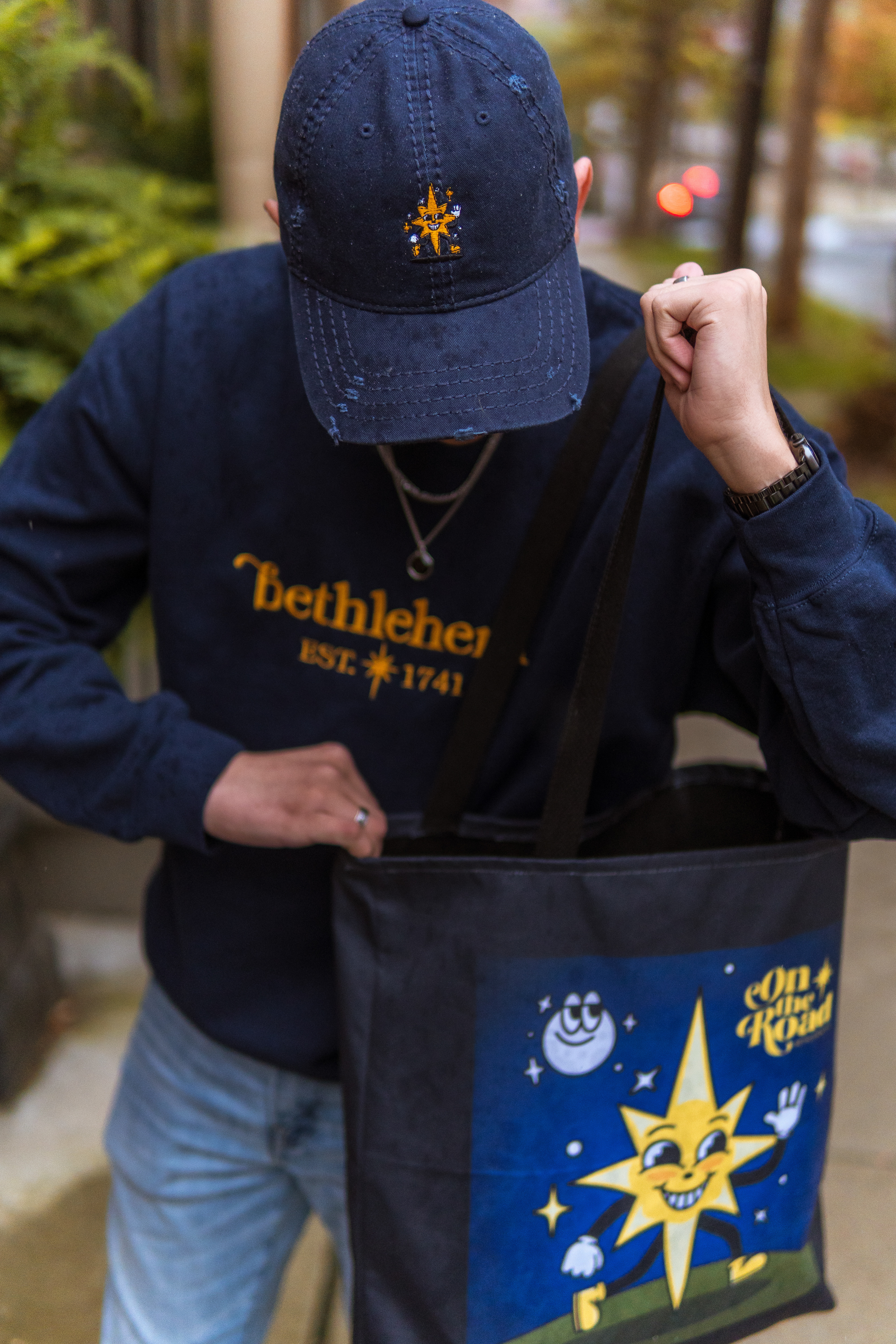 “On the Road” is my traveling merch series, with each drop inspired by a new city. This stop: my hometown in Bethlehem, PA. The collection reimagines the iconic Bethlehem Star, giving him a retro personality across stickers and a tote bag, while a custom-typography sweatshirt and hat round out the lineup. The whole drop is designed with the worn-in warmth of vintage sweatshirts you’d thrift or inherit from family. Pieces that already feel like they’ve got a story to tell.